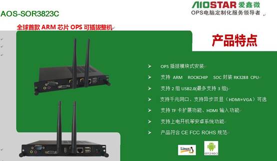 跟隨著校園數字化網絡,教學模式的轉變使得各種教育信息的表達更加生動、直觀和多樣化,為教學帶來了令人矚目的變化。相對應的OPS電腦硬件、內存和處理器整體性需求的也相對提高,在此愛鑫微隆重推出一款ARM系列OPS電腦,型號為AOS-SOR3823C,支持 ARM  ROCKCHIP  SOC封裝RK3288 CPU;ARM芯片OPS可插拔整機,支持2組USB2.0(最多支持3組); 支持千兆網口、支持異步雙顯(HDMI+VGA)可選;支持TF卡擴展功能、HDMI輸入功能;支持上電開機等Android安卓系統功能。愛鑫微電子產品可配合客戶的應用方面需求,使用需求進行定制生產。